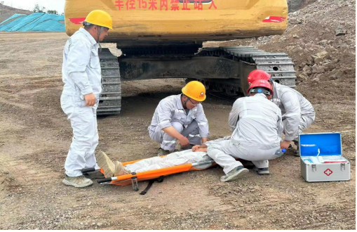 本次演練主要模擬515平臺發生車輛傷害事故,一名員工被挖機回轉時碰傷倒地,頭部撞擊受傷,傷情嚴重,進行緊急救援的情景。